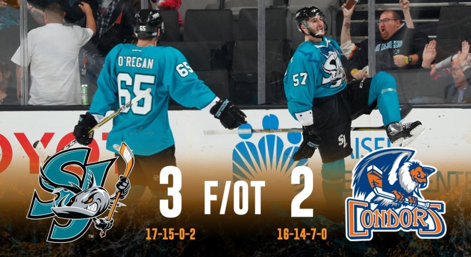 SAN JOSE — Nick DeSimone scored the game-winning goal with five seconds left in overtime to give the San Jose Barracuda (17-15-0-2) a 3-2 victory over the Bakersfield Condors (16-15-6-0) in a Monday matinee on Martin Luther King Jr. Day at the SAP Center.