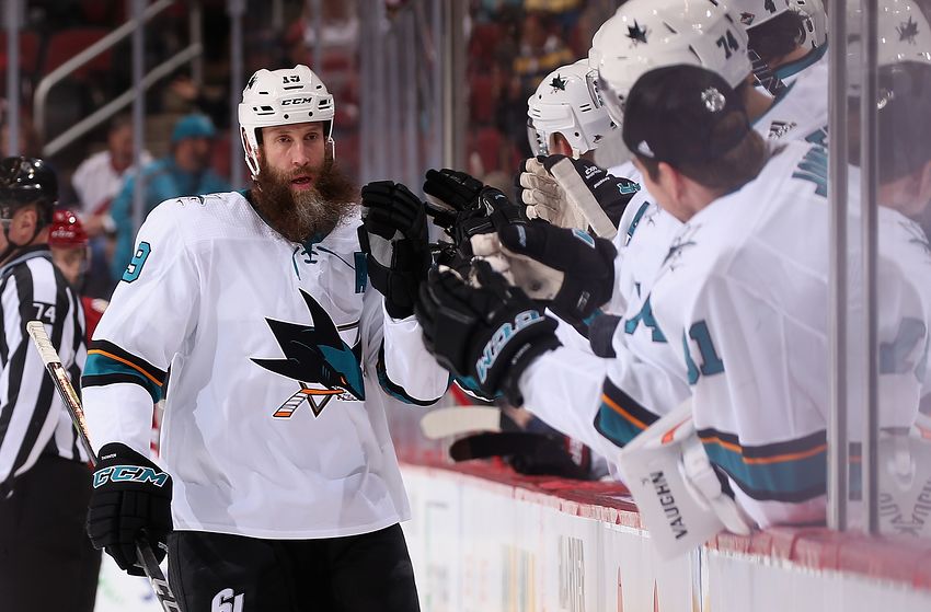 photo file from goldengatesports.com: San Jose Sharks Joe Thornton shown in victory lap after goal score against the Arizona Coyotes in Glendale on January 16th