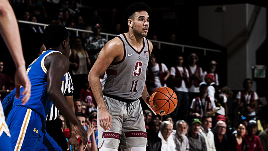 photo by gostanford.com: The Stanford Cardinal’s Dorian Pickens (11) takes the dribble in the double overtime contest at Maples Pavilion earlier this season against the UCLA Bruins
