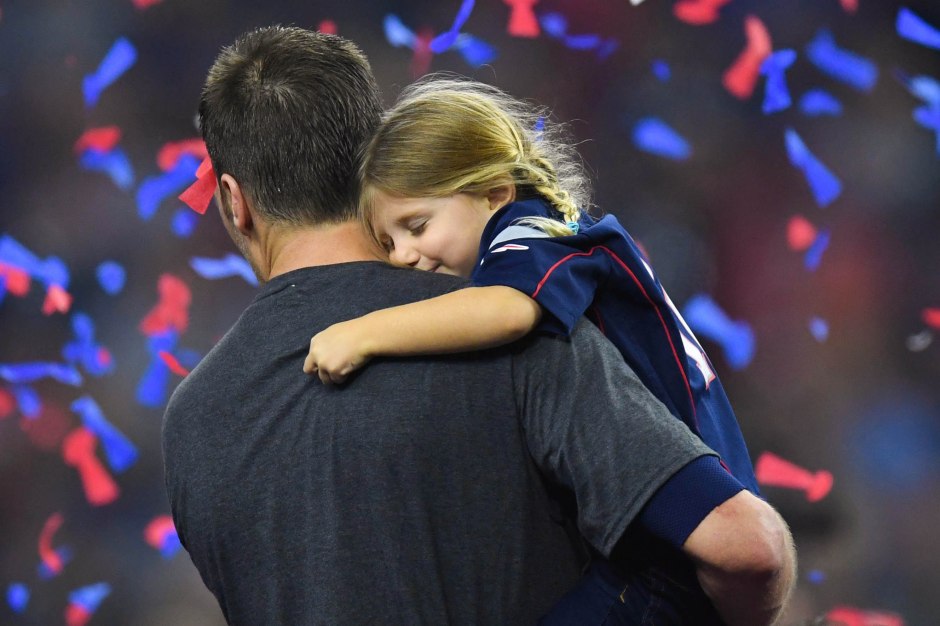 photo by csnne.com: New England Patriots quarterback Tom Brady carrying five year old Vivian Brady following football game