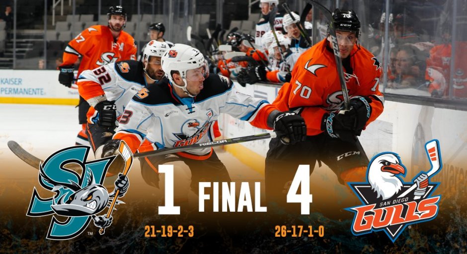 SAN JOSE — The San Diego Gulls (26-17-1-0) came from behind once again, scoring four unanswered goals in a convincing 4-1 win over the San Jose Barracuda (21-19-2-3) Sunday afternoon at the SAP Center. They swept the two-game series against San Jose and won their season best sixth win in a row.