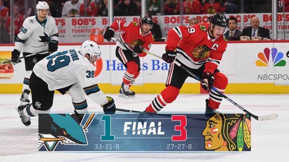 The Sharks lost to the Hawks 3-1 on the road. J.F. Berube stopped 42 of 43 shots for Chicago. Jones made 33 of 35 saves in a losing effort for San Jose.