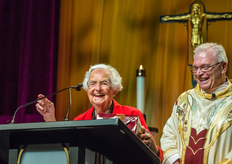 Families and students gather at the Gentile Arena for “Family Mass” August 21, 2014, where Father Michael Garanzini proclaimed Sister Jean Delores Schmidt, BVM Day, also her 95th birthday. | Sun-Times files