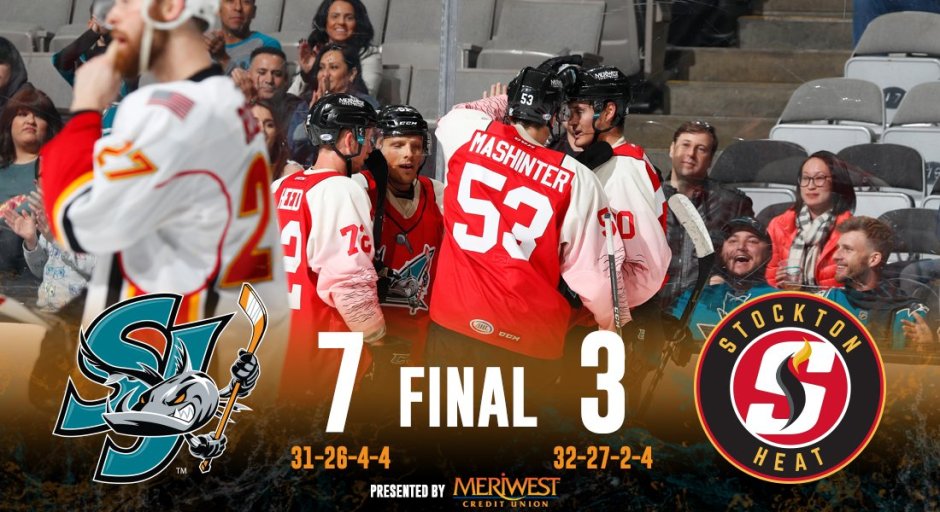 SAN JOSE — The San Jose Barracuda (31-26-4-4), with their backs against the wall, received the game-winning goal from defenseman Julius Bergman seven minutes into the third period, where they scored four unanswered goals, to defeat the Stockton Heat (32-27-2-4) 7-3 and swept the home-and-home series on Saturday afternoon at the SAP Center. The Cuda’s current three-game win streak have their playoff hopes still hanging by a thread.