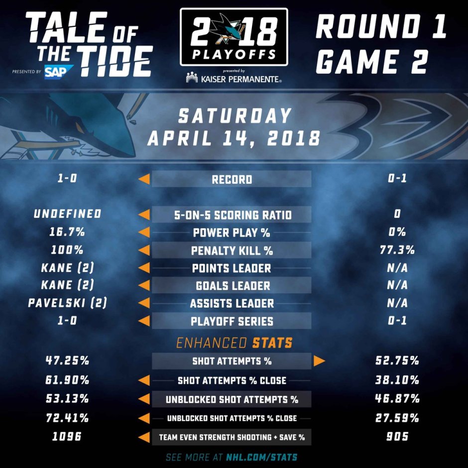 @SanJoseSharks photo: Game one stats the power play was in effect for the Sharks at the Honda Center on Thursday night as the Ducks look to even the score and the Sharks hope to take two back to San Jose tonight