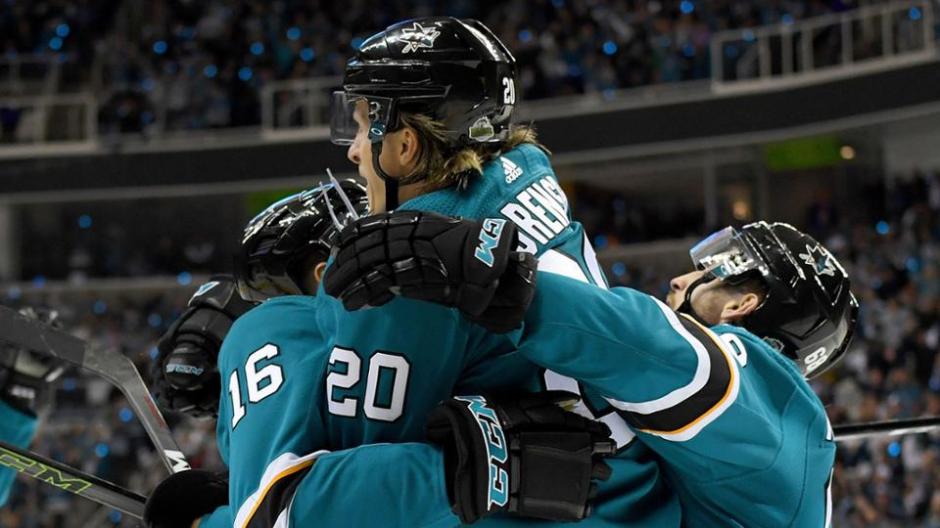 nhl.com photo: The San Jose Sharks left winger Marcus Sorenson (20) gets hugged up from teammates center Eric Fehr (16) and center Melker Karlsson (68) as Sorenson scored against the Anaheim Ducks at SAP Center on Monday night in game three