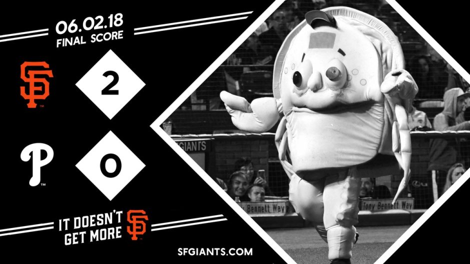The Giants finally got on the board in the bottom of the sixth inning as Joe Panik doubled off of eventual losing pitcher Vince Velasquez, went to third on a Brandon Crawford and then made a great slide to avoid the Jorge Alfaro tag at home plate on a ball hit by Andrew McCutchen to give the Giants a 1-0 lead. The play was so close that Phillies manager Gabe Kapler challenged the call, and after a 1:35 review, the call stood and the Giants were in the lead.