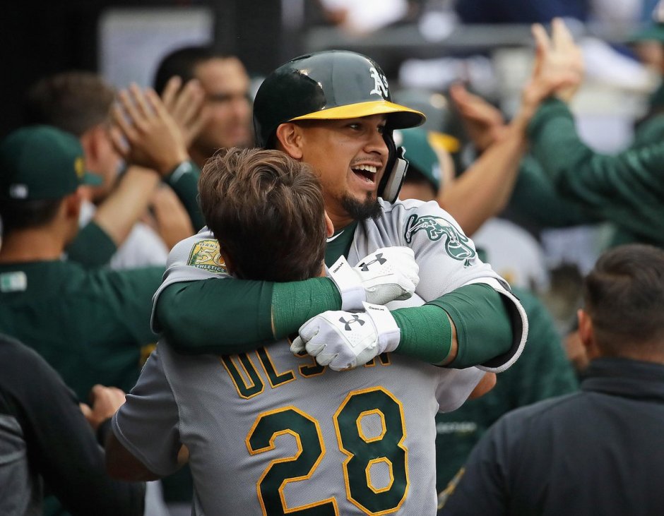 The White Sox scored in the bottom of the sixth off Manaea on an unusual twin killing. With runners at second and third, Jose Abreu came home on Kevan Smith’s bouncer to Lowrie. Matt Davidson decided to leave for third once the throw came to Olson at first, but Olson’s throw got him at third to end the inning with the A’s up 8-1.