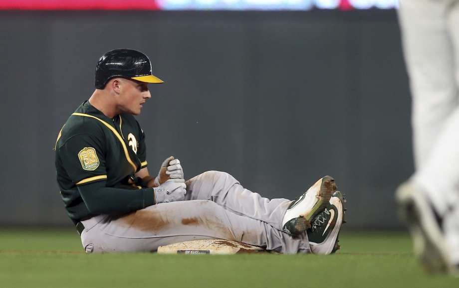 sfgate.com photo: Oakland Athletics’ Matt Chapman sits on second base after doubling off Minnesota Twins pitcher Kohl Stewart in the fifth inning of a baseball game Thursday, Aug. 23, 2018, in Minneapolis.