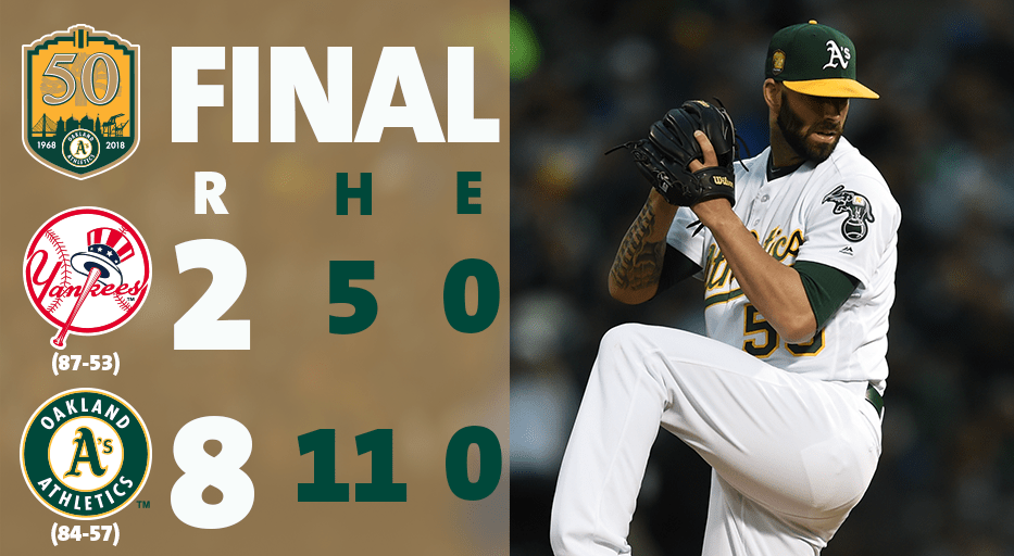 The A’s bullpen continued to shine as Lou Trivino set the Yanks down in order in the eighth and Cory Gearrin closed the door on them in the ninth. The A’s won their 84th game of the year.