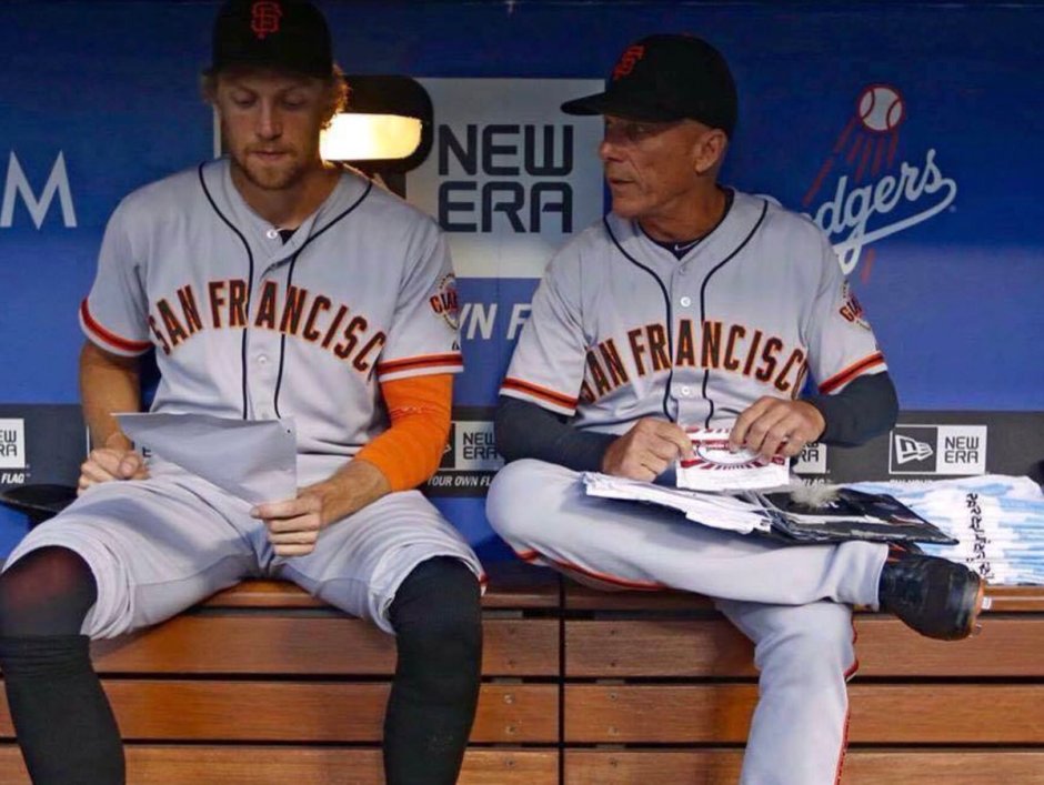 @SFGiants file photo: Hunter Pence (left) sits with former coach Tim Flannery at Dodger Stadium during Flannery’s time with the team. Pence is expected to finish his tenure with the Giants this week.