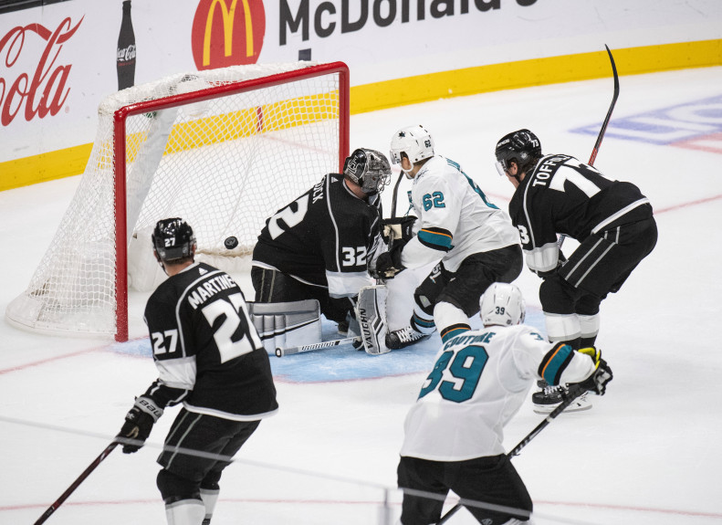 dailynews.com photo: San Jose Sharks right wing Kevin Labanc, top center, scores the game-winning goal past Kings goaltender Jonathan Quick during the overtime period of Friday night’s season opener at Staples Center