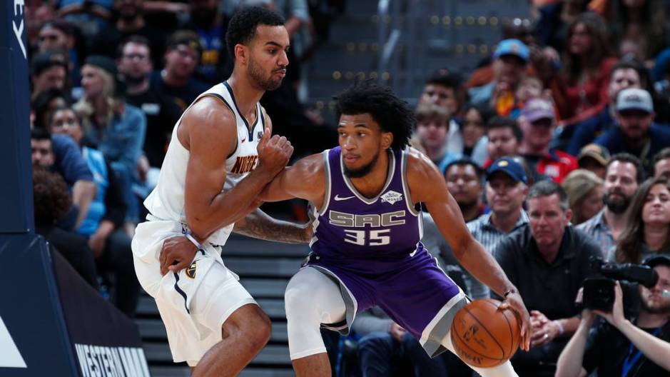 photo from the sacbee.com: Kings forward Marvin Bagley III, right, works against Denver Nuggets forward Trey Lyles on Tuesday at Pepsi Center. Bagley scored 20 points in the Kings’ 126-112 loss