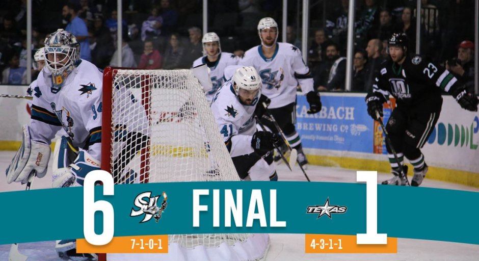 It wasn’t exactly the “Four Dead in Five Gun Fight” 137 years ago in Texas, but it was as close as it could get for a hockey game. The San Jose Barracuda (7-1-0-1) scored four goals in the second period in a 6-1 thrashing of the Texas Stars (4-3-1-1) on Saturday evening at H-E-B Center at Cedar Park to sweep their two-game Texas road trip.