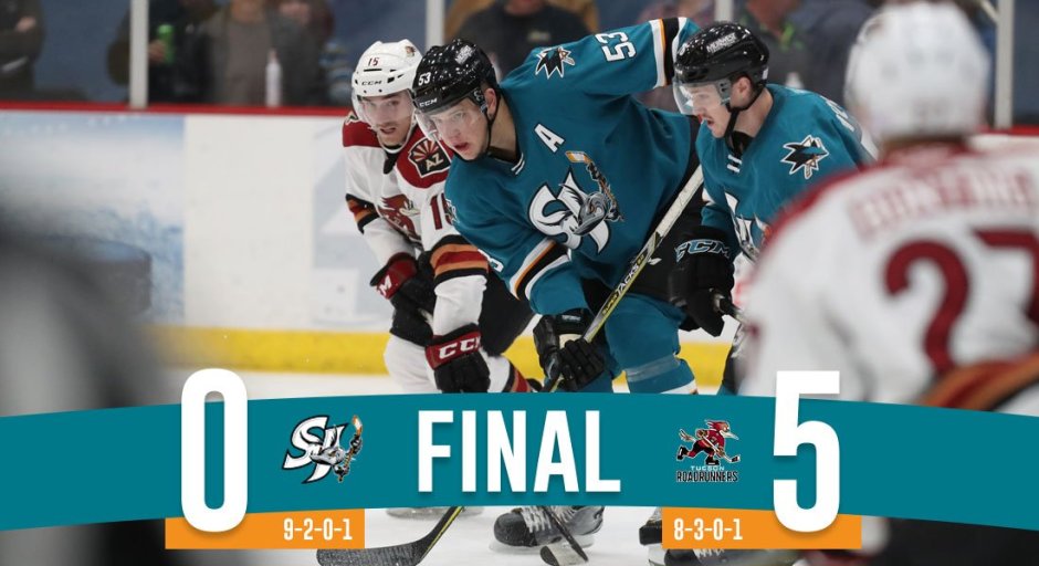The defending Pacific champion Tucson Roadrunners (8-3-0-1) received two power play goals from Adam Helewka and dominated the San Jose Barracuda (9-2-0-1) from start to finish in a 5-0 shutout victory on Friday evening at the Tucson Convention Center Arena. The loss snapped the Cuda’s four-game winning streak and undefeated record on the road.