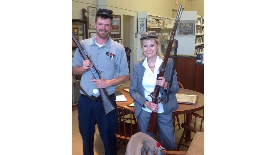 photo from cnn.com: Mississippi Senator and Republican candidate Cindy Hyde-Smith wearing Confederate hat and carrying authentic Confederate rifle from the Civil War has received two donations from San Francisco Giants majority owner Charles B Smith