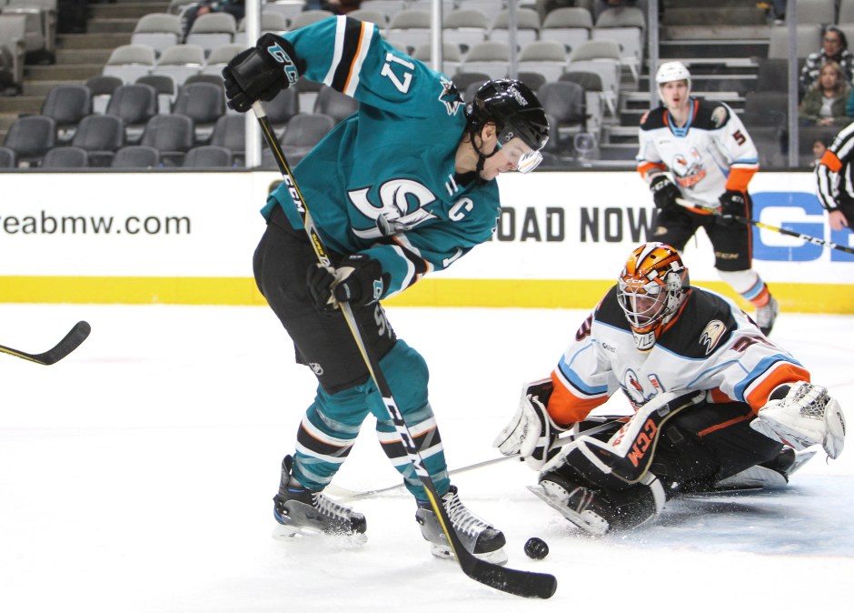 Photo credit: San Diego Gulls goaltender Kevin Boyle makes a save against San Jose Barracuda forward John McCarthy. Photo courtesy of the San Jose Barracuda.