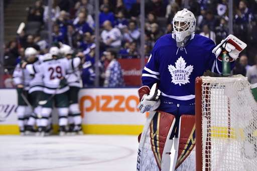 msn photo: Toronto Maple Leafs goaltender Michael Hutchinson (30) looks on as Minnesota Wild players celebrate a goal by Zach Parise (11) during the third period of an NHL hockey game, Thursday, Jan. 3, 2019 in Toronto.
