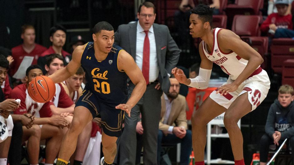 photo from calbears.com: The Cal Bears Matt Bradley (20) drives on the Stanford Cardinal (0) KZ Okpala in Thursday night’s game at Maples Pavilion