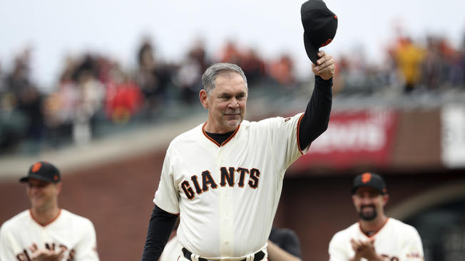 photo from nbcbayareasports.com: San Francisco Giants manager Bruce Bochy doffs his cap to the fans at the introduction of the Giants at the home opener at Oracle Park in San Francisco on Friday afternoon vs. the Tampa Bay Rays.