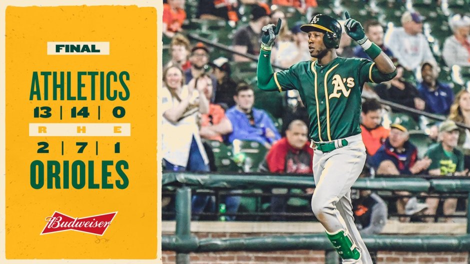 Oakland’s middle infield was responsible for driving in nine of its runs on Tuesday, as the Athletics hammered Baltimore 13-2 at Camden Yards. It was the A’s first road win of the season and ended a four-game losing streak.
