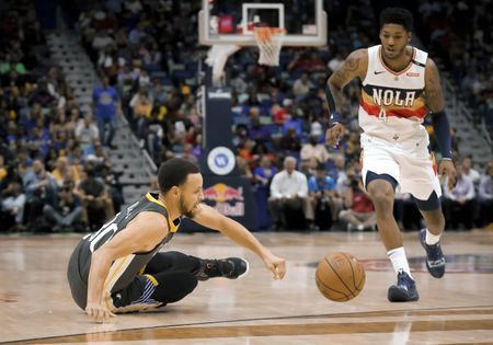 photo from yahoosports.com: Golden State Warriors guard Stephen Curry (30) trips as New Orleans Pelicans guard Elfrid Payton (4) looks on during the first quarter at the Smoothie King Center. photo Credit: Derick E. Hingle-USA TODAY Sports