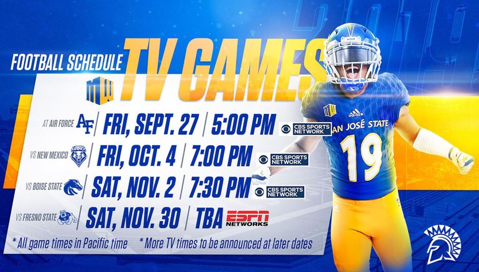 San Jose State will be playing twice on Friday night starting with their Friday, September 27 conference opener at Air Force on CBSSN starting at 6:00 pm MT/5:00 pm PT. SJSU will be on CBSSN again the following Friday, October 4 for a 7:00 pm PT conference home game vs. New Mexico in CEFCU Stadium.