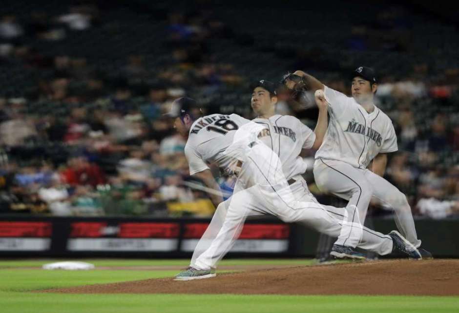 photo sfgate.com: In this multiple-exposure photo, Seattle Mariners starting pitcher Yusei Kikuchi throws against the Oakland Athletics during the sixth inning of a baseball game, Monday, May 13, 2019, in Seattle.