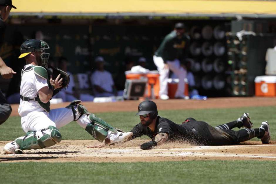 sfgate.com photo: San Francisco Giants’ Kevin Pillar, right, slides into home to score a run next to Oakland Athletics catcher Chris Herrmann during the second inning of a baseball game in Oakland, Calif.
