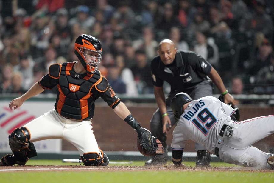 photo from sfgate.com: Miami Marlins’ Miguel Rojas (19) is safe at home as San Francisco Giants catcher Buster Posey, left, can’t make the tag in time during the eighth inning of a baseball game Saturday, Sept. 14, 2019, in San Francisco.