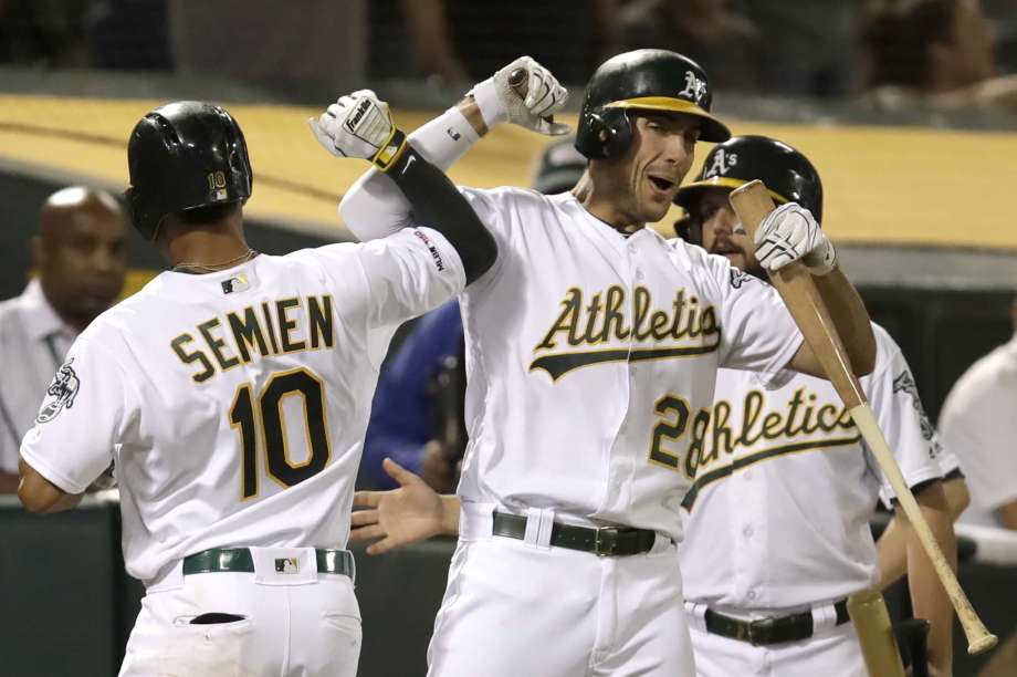 photo from sfgate.com: Oakland Athletics’ Marcus Semien (10) celebrates with Matt Olson, right, after hitting a home run against the Texas Rangers during the fifth inning of a baseball game Saturday, Sept. 21, 2019, in Oakland, Calif.