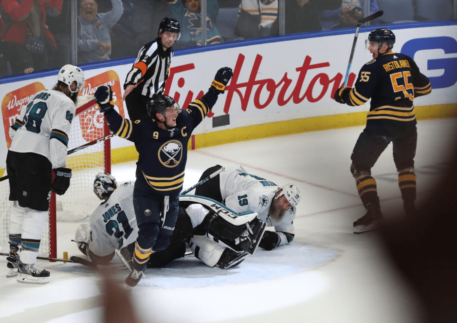 The Sabres remained perfect at home as the Sharks were able to take a point in the first of a five-game road trip, thanks to San Jose goalie Martin Jones with saves in the beginning versus Jeff Skinner and near the end stopping Eichel for example.
