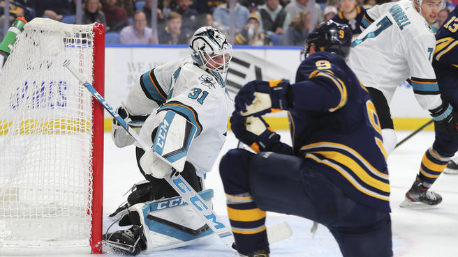 #2 The Sharks had a 2-0 lead after the first period, but the Sabers came roaring back with two goals in the second period to tie it up.