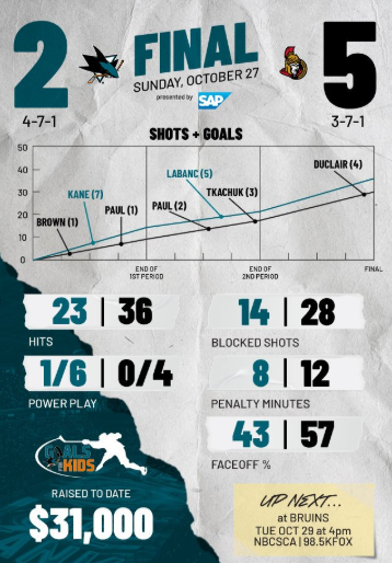 The San Jose Sharks lost to the Ottawa Senators 5-2 at Canadian Tire Centre on Sunday. Ottawa goals came from Nick Paul (2), Connor Brown, Brady Tkachuk, and Anthony DuClair. Sens goaltender Craig Anderson made 34 saves in the win. Sharks goals came from Evander Kane and Kevin Labanc. Sharks goaltender Aaron Dell made 18 saves in the first two periods. Martin Jones made 7 saves in the third period.