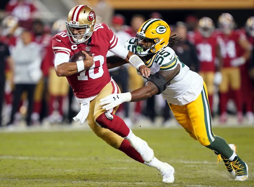 #2 For 49ers quarterback Jimmy Garoppolo, a great night of throwing the football: 14-20, 253 yards, and got the team in the redzone enough to crush the Green Bay defense.