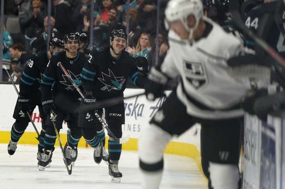 photo from sfgate.com: San Jose Sharks center Noah Gregor, center, celebrates with teammates on the bench after scoring a goal against the Los Angeles Kings during the second period of an NHL hockey game in San Jose, Calif., Friday, Nov. 29, 2019.