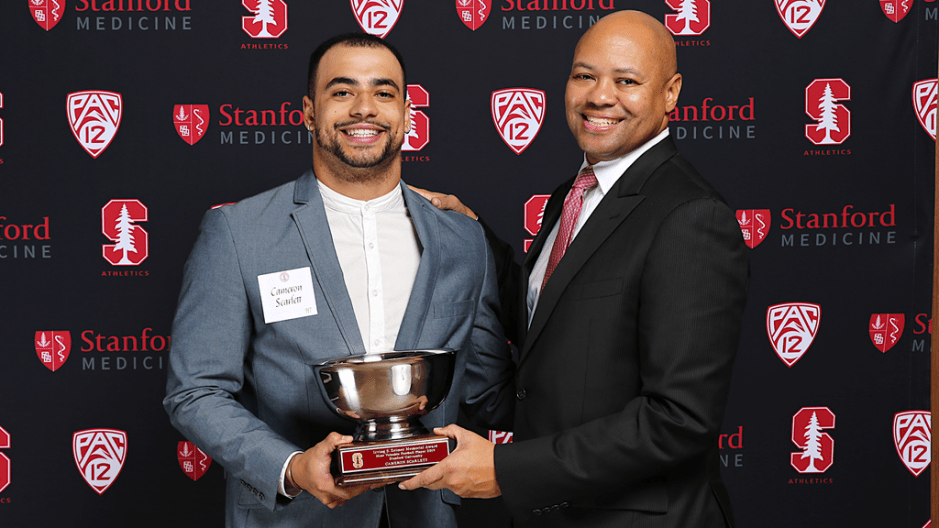 Fifth-year running back Cameron Scarlett received the Irving S. Zeimer Award as the team’s most valuable player while fifth-year outside linebacker Casey Toohill earned the Al Masters Award for leadership and respect from his teammates at Stanford football’s annual banquet at Traitel Hall at the Hoover Institution on Sunday.