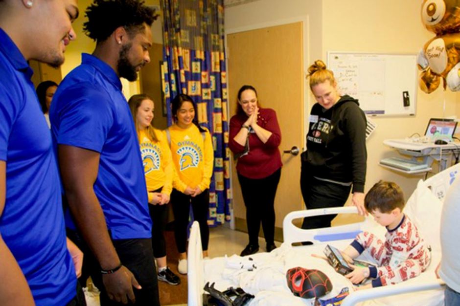 San Jose State football linebackers Tysyn Parker and Alii Matau and gymnasts Chelsey Andrada, Jada Mazury and Emma Milne spent an afternoon after final exams distributing toys to children in the pediatric unit of Good Samaritan Hospital in Los Gatos, Calif.