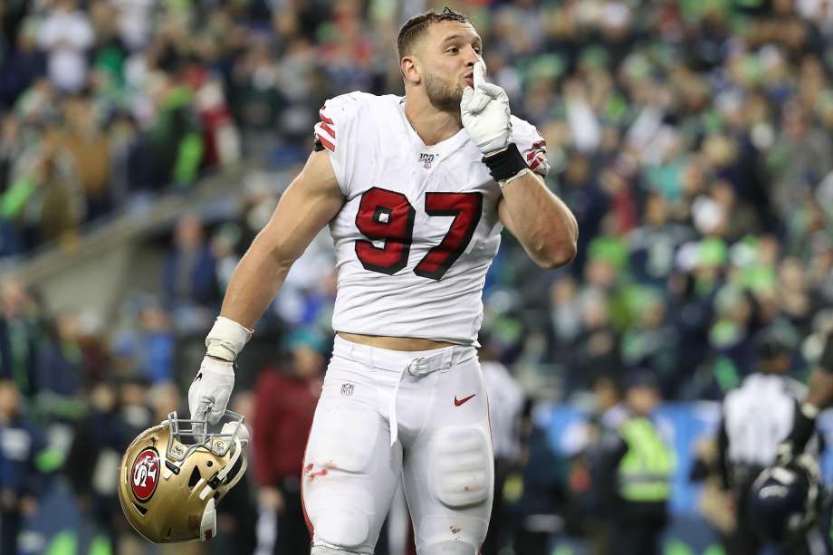 photo from sfgate.com: The San Francisco 49ers Nick Bosa (54) silences the Seattle Seahawks crowd on Sunday at Century Link Field