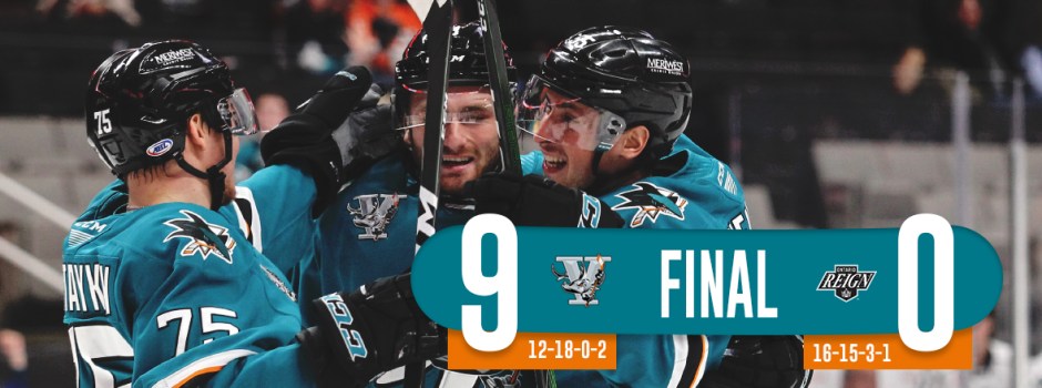 SAN JOSE, Calif- The San Jose Barracuda made a huge statement to start their four-game homestand. A five-goal second period was just one of the highlights in a 9-0 shutout pounding over the Ontario Reign on Wednesday evening at SAP Center. The nine goals matched a franchise record they set earlier this season in a 9-2 win against the same Ontario team back on December 6th, 2019.