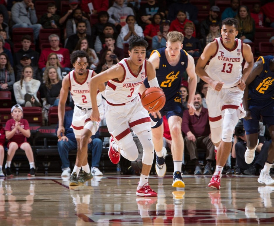 gostanford.com photo: The Stanford Cardinal Tyrell Terry dribbles up the floor against the Cal Bears in the Pac 12 Conference game opener on Jan 2. The Cardinal host the Washington State Cougars tonight at Maple Pavilion