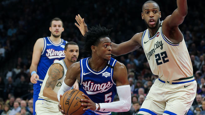 nbcsports.com photo: De’Aaron Fox (5) of the Sacramento Kings drives on the Milwaukee Bucks Khris Middleton (22) at Golden One Center on Friday night