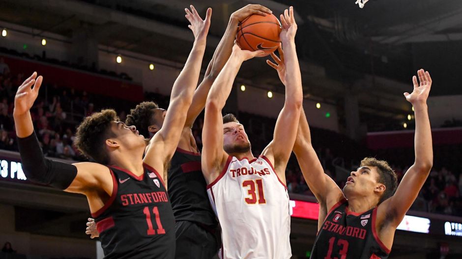 gostanford.com photo: The USC Trojan’s Nick Rakocevic (31) is surrounded by the Stanford Cardinals’ Jaiden Declaire (11) and Oscar Da Silva (13) on Saturday night at USC