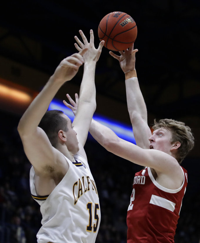 Stanford’s James Keefe, right, shoots against California’s Grant Anticevich (15) in the first half of an NCAA college basketball game Sunday, Jan. 26, 2020, in Berkeley, Calif. (AP Photo/Ben Margot)