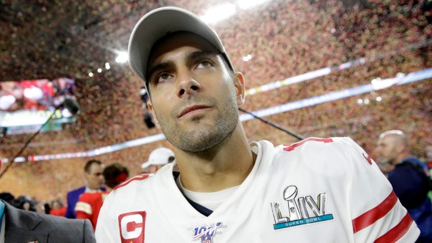 photo from boston.com: San Francisco 49ers quarterback Jimmy Garoppolo looking glum after the 49ers loss in Super Bowl LIV in Miami’s Hard Rock Stadium Sun Feb 2