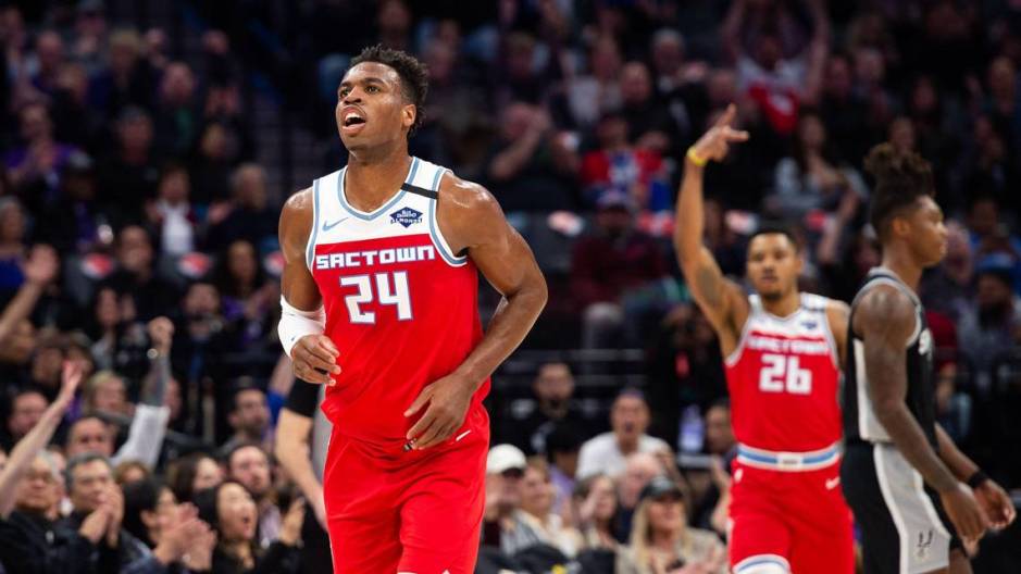 photo from sacbee.com: Sacramento Kings guard Buddy Hield (24) trots back for defense after scoring a three-pointer against the San Antonio Spurs during the first half of their NBA game Saturday, Feb. 8, 2020, at Golden 1 Center in Sacramento