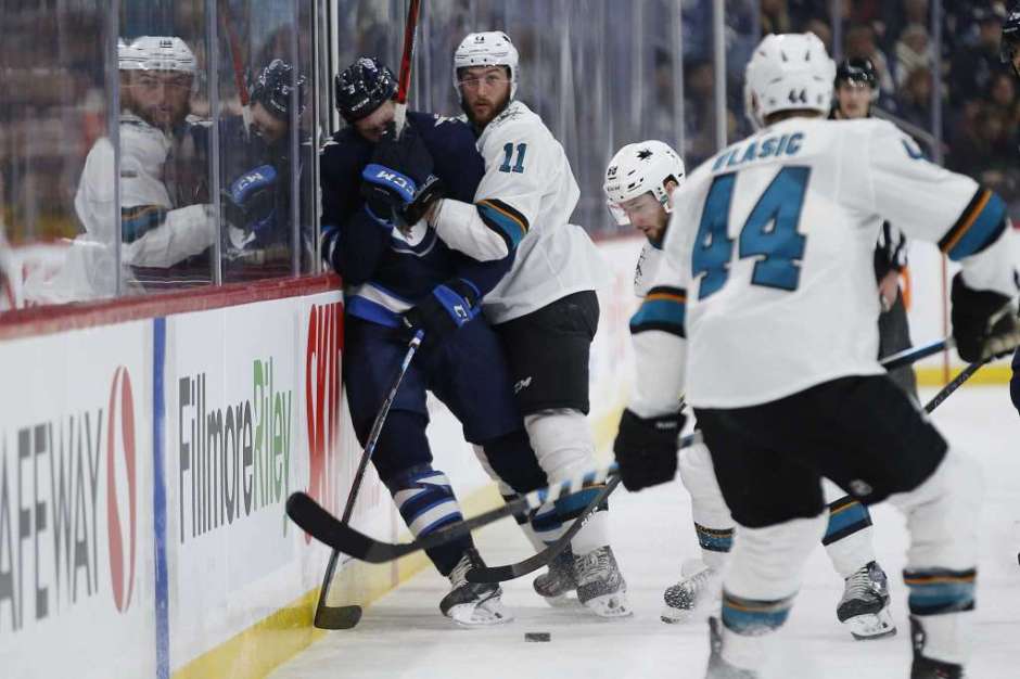 photo from sfgate.com: San Jose Sharks’ Stefan Noesen (11) draws a high-sticking penalty with this check on Winnipeg Jets’ Tucker Poolman (3) during the second period of an NHL hockey game Friday, Feb. 14, 2020, in Winnipeg, Manitoba.