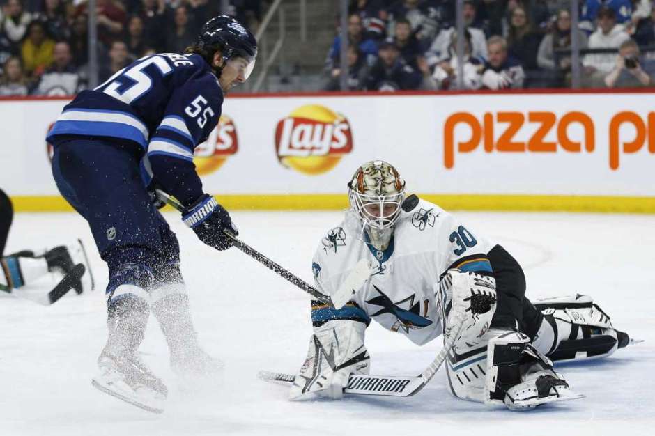 photo from sfgate.com: The San Jose Sharks goaltender Aaron Dell (30) puts the stop on the Winnipeg Jets Mark Scheifele’s (55) shot attempt in Saturday night’s contest in Winnipeg