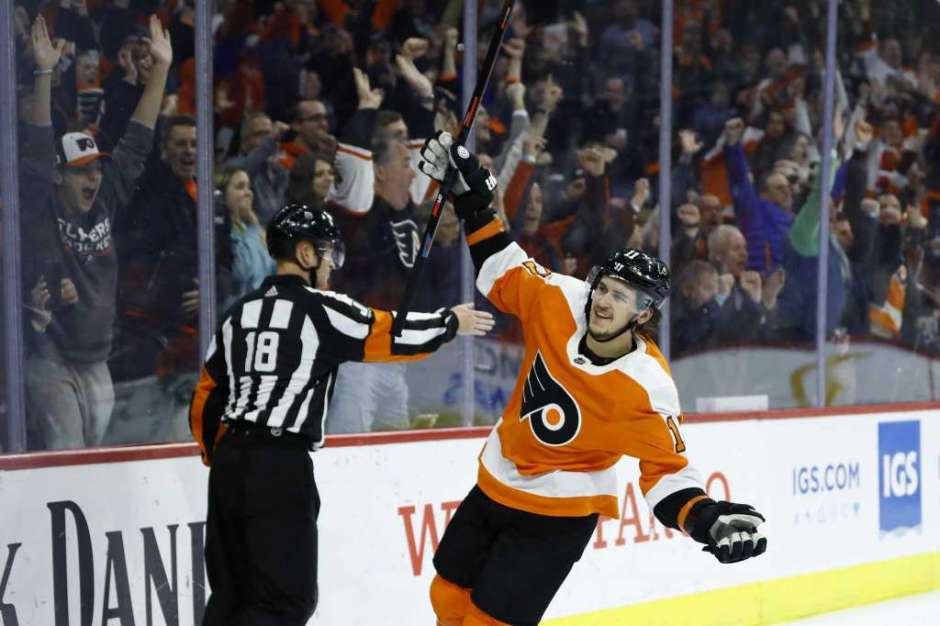 photo from sfgate.com: Philadelphia Flyers’ Travis Konecny celebrates after scoring a goal during the second period of an NHL hockey game against the San Jose Sharks, Tuesday, Feb. 25, 2020, in Philadelphia.