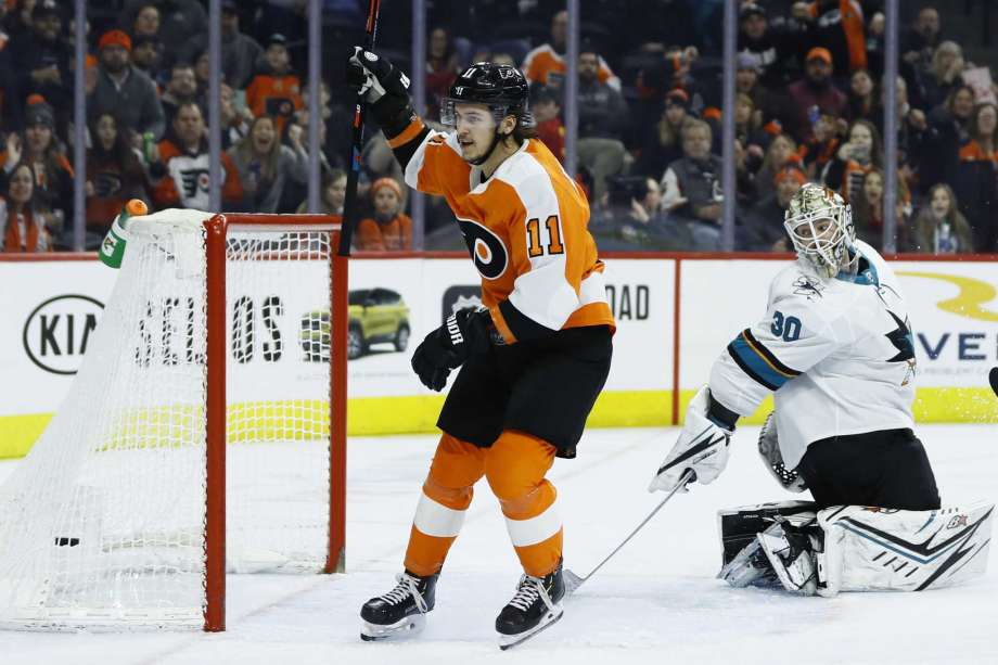photo from sfgate.com: Philadelphia Flyers’ Travis Konecny (11) celebrates after scoring a goal against San Jose Sharks’ Aaron Dell (30) during the second period of an NHL hockey game, Tuesday, Feb. 25, 2020, in Philadelphia.